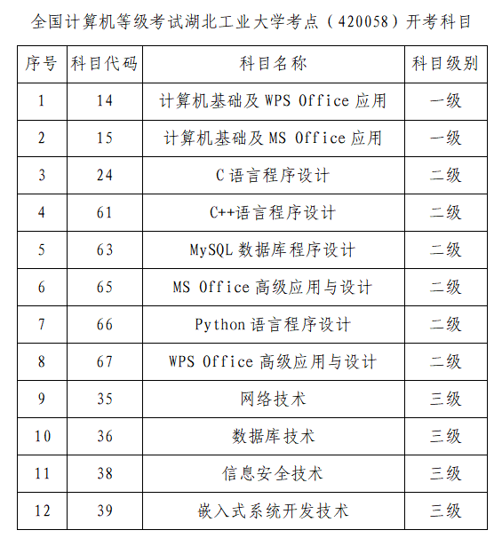 附件:全国计算机等级考试湖北工业大学考点(420058)开考科目