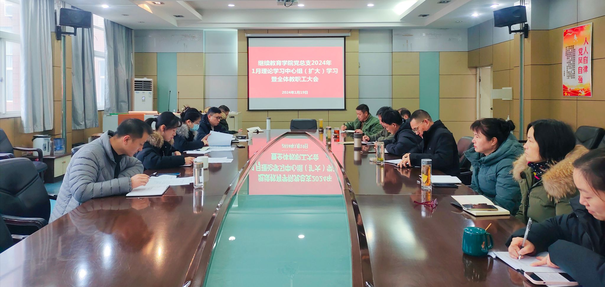 2024年1月19日,继续教育学院召开2024年1月理论学习中心组(扩大)学习暨期末全体教职工大会。会议由党总支书记汪晶晶主持,全体教职工参加了会议。