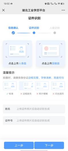 第五步:上传身份证正反面照片,需正确上传且与登录时输入的身份证号一致